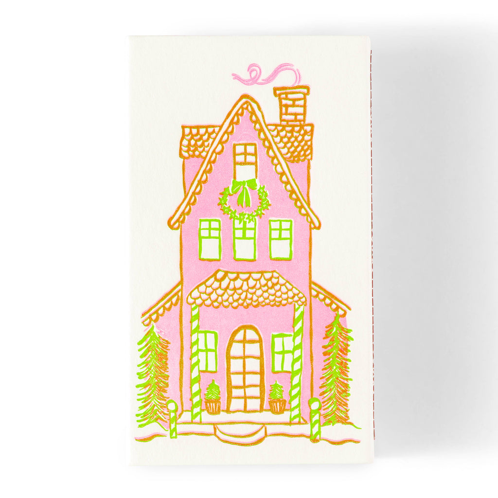 This sweet little holiday house gives cozy, candy-cane cottage vibes. With a wreath, trees, and pink smoke curling from the chimney, it’s letterpress printed in festive pink, green, and brown—perfect for lighting candles, gifting, or adding a little holiday magic. The design is hand-drawn and printed using traditional letterpress techniques, giving each box a satisfyingly tactile feel and slight variations that make every piece a little one-of-a-kind. Whether styled on a shelf or tucked beside your favorite candle, it’s as much a conversation piece as it is a practical tool. These matches are functional, fun, and made to be shared. Use them to light candles, incense, or a cozy fire pit—and keep a few on hand for the perfect small gift. Everyone needs matches, and these just do it with more style! Details: - 4.625" x 2.625" x .875" - Letterpress printed on 111# 35% cotton paper - 50 3.75” long matches - Strike only on striker side of box - Printed and Designed in the USA